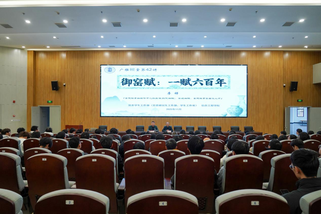 11月28日下午,1989级校友、景德镇市融媒体中心副主任李祥主讲的“广雅鳣堂”第42讲——《御窑赋:一赋六百年》,在研究生艺术实验大楼报告厅举办。本次讲座由信息工程学院党委书记李慧颖主持,吸引200余名师生到场聆听。