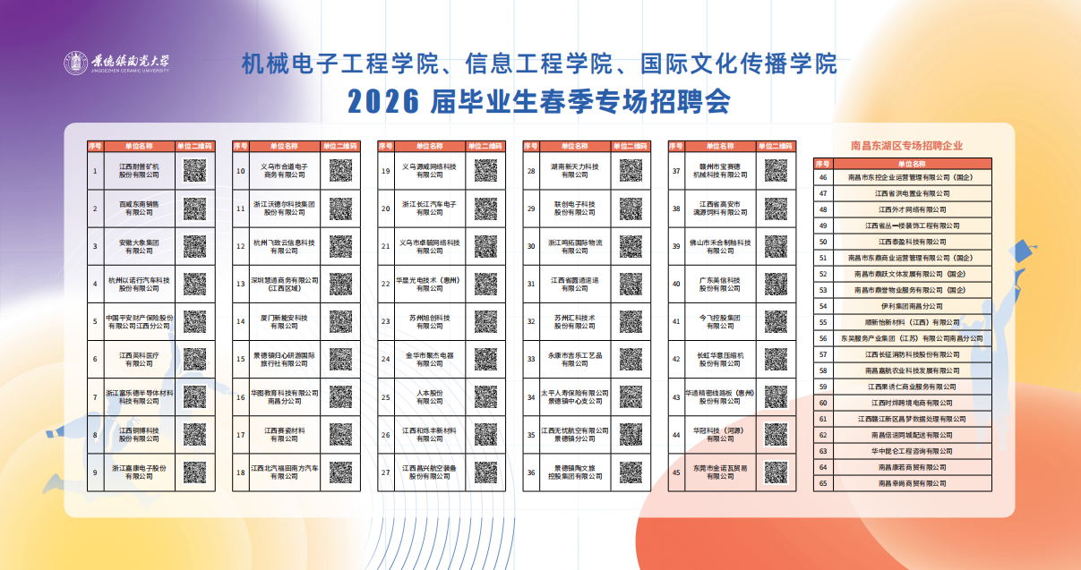 3月26日上午,信息工程学院与机械电子工程学院、国际文化传播学院在景德镇陶瓷大学湘湖校区尚学楼中心广场联合举办2026届毕业生春季专场招聘会。